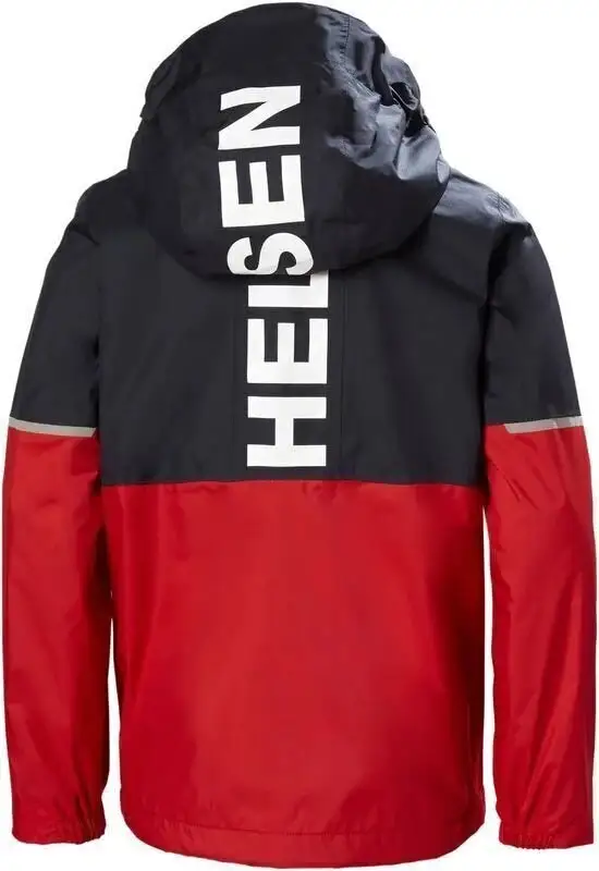 En let regnjakke med stort Helly Hansen logo og hætte.