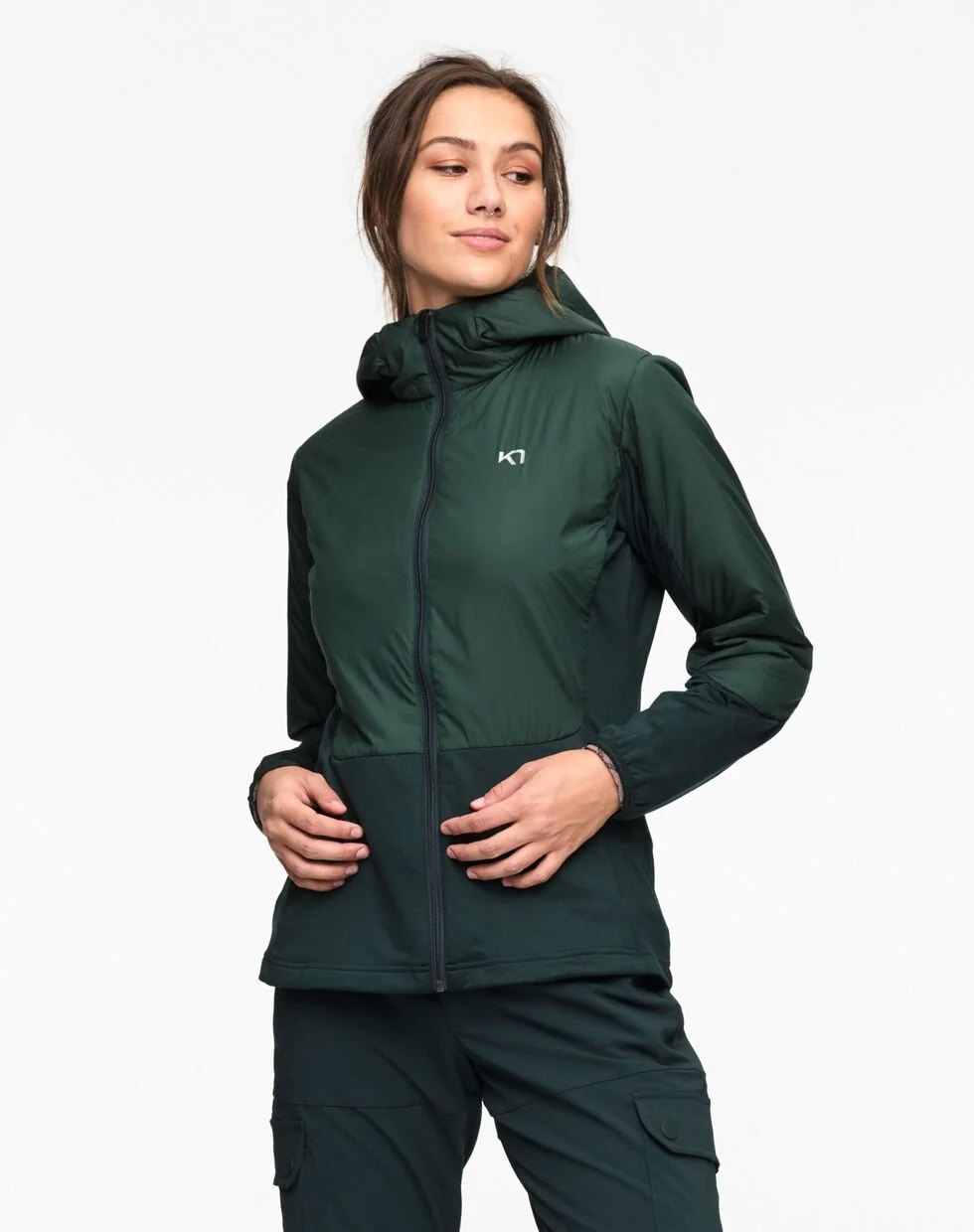 Kari Traa Sanne Hybrid er en vandafvisende mellemlagsjakke til kvinder med gennemgående lynlås i et faconsyet design. Den er fremstillet af bløde, åndbare materialer med strategisk placerede elastiske sektioner, der giver ekstra komfort og følger dine bevægelser. Det unikke materiale føles fantastisk, og det lette polyesterfor holder dig varm. Der er en hætte i tilfælde af, at vejret driller, og to lommer til opbevaring eller dine hænder.