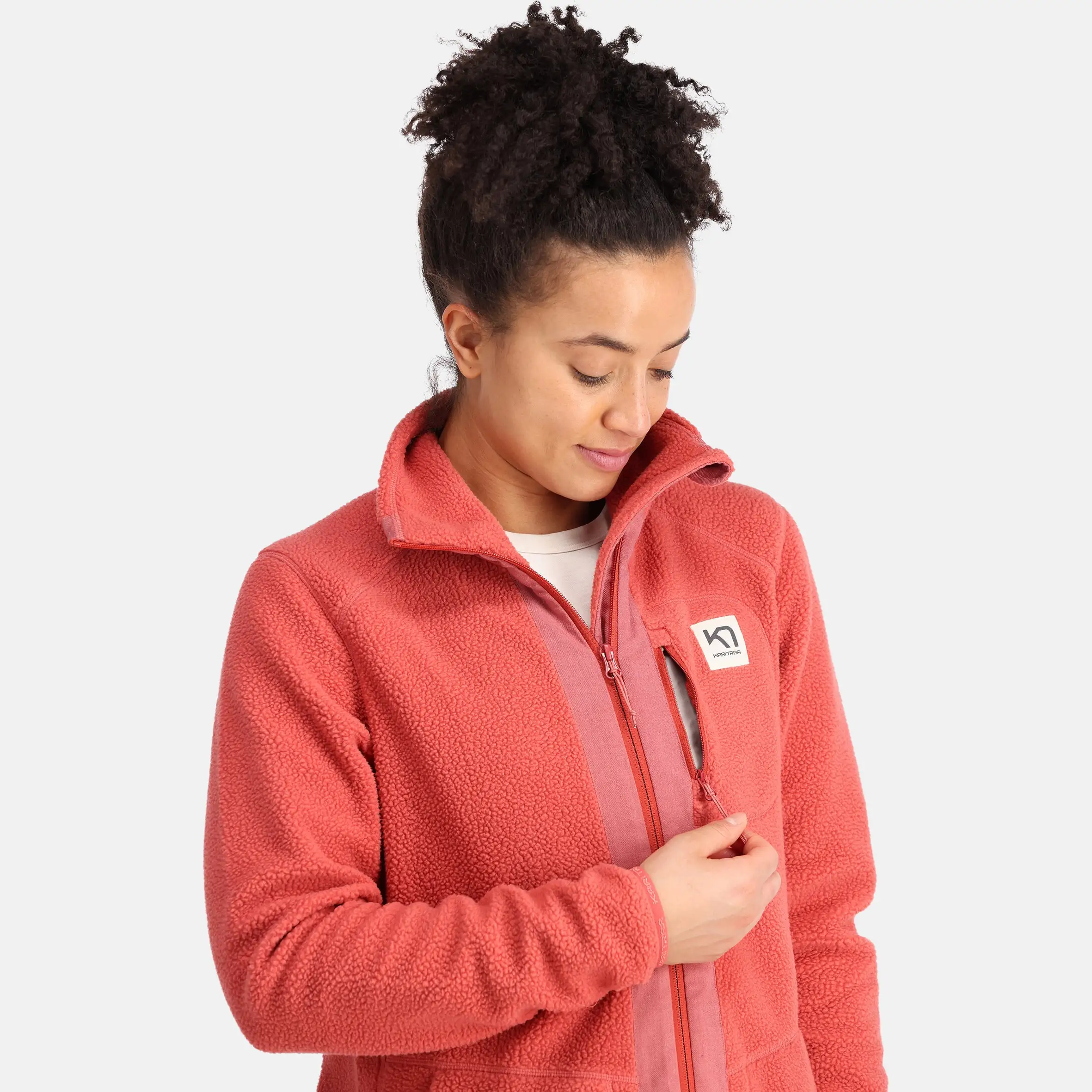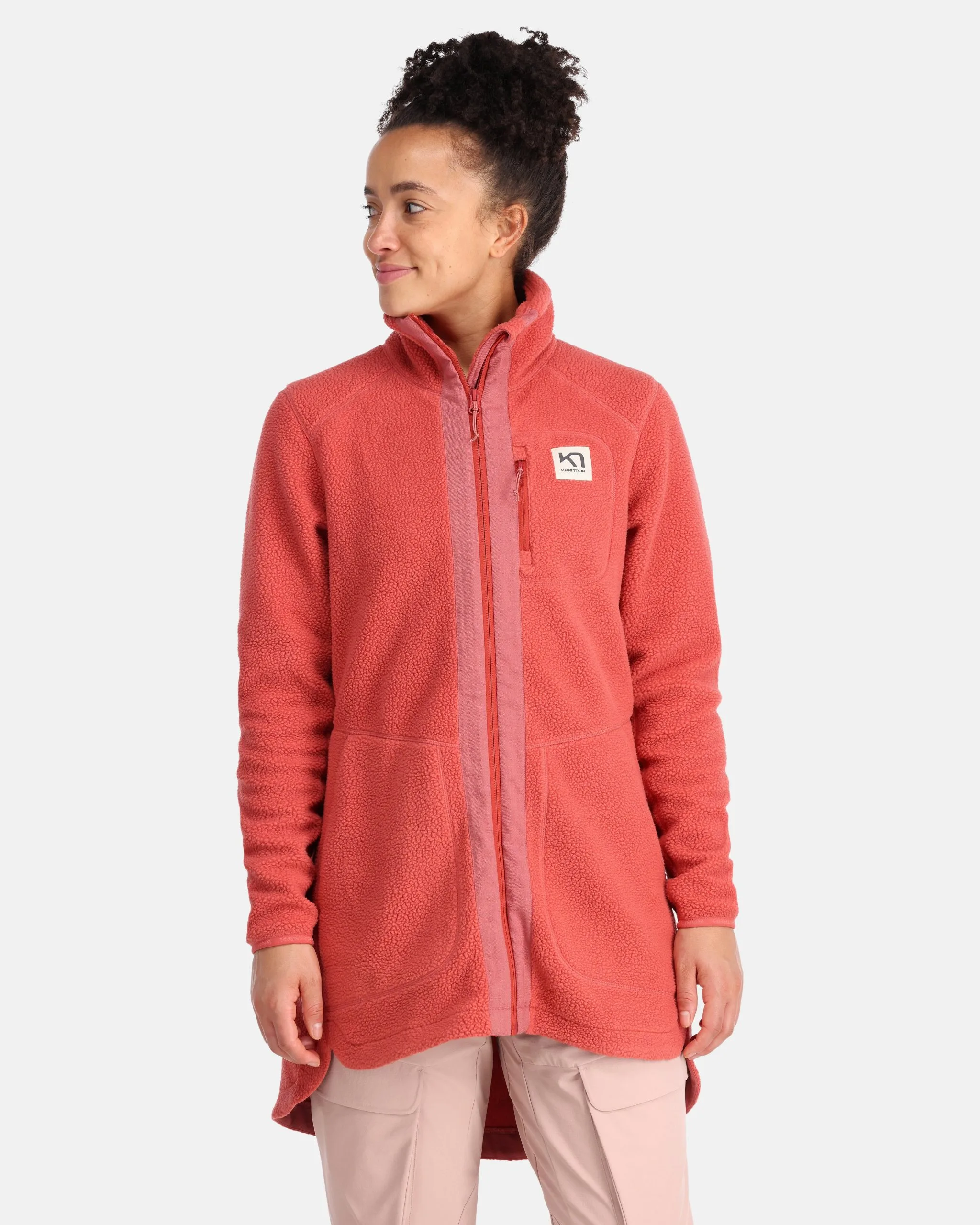 Kari Traa Sanne Pile Jacket er en fleecejakke med langt snit til kvinder med et varmt, cool look. Den giver en glat, strømlinet finish med flatlock-sømme, der forhindrer gnidninger. Underarmspaneler betyder, at den ikke fylder eller klumper sig, hvilket gør den perfekt til flere lag på kølige sommeraftener eller som mellemlag, når de koldere årstider starter. Og du kan nyde udendørslivet med god samvittighed: Den bruger genbrugsmaterialer.