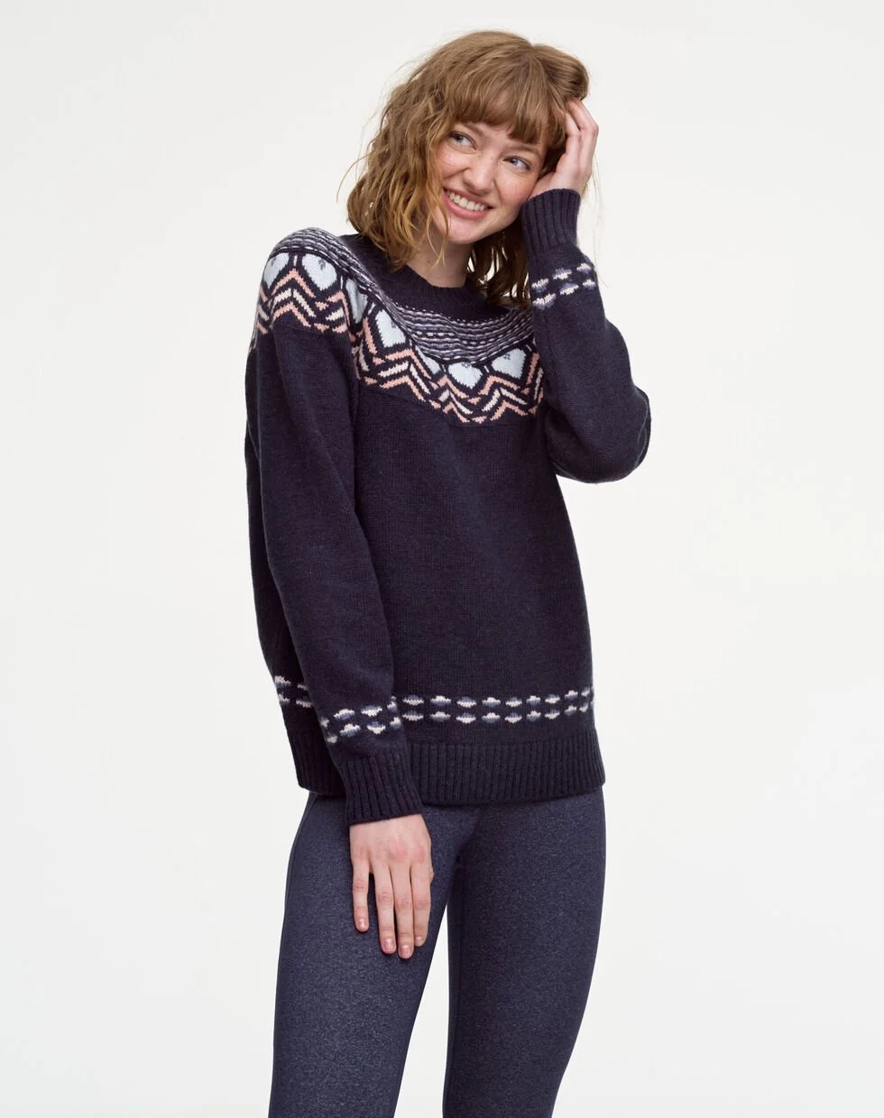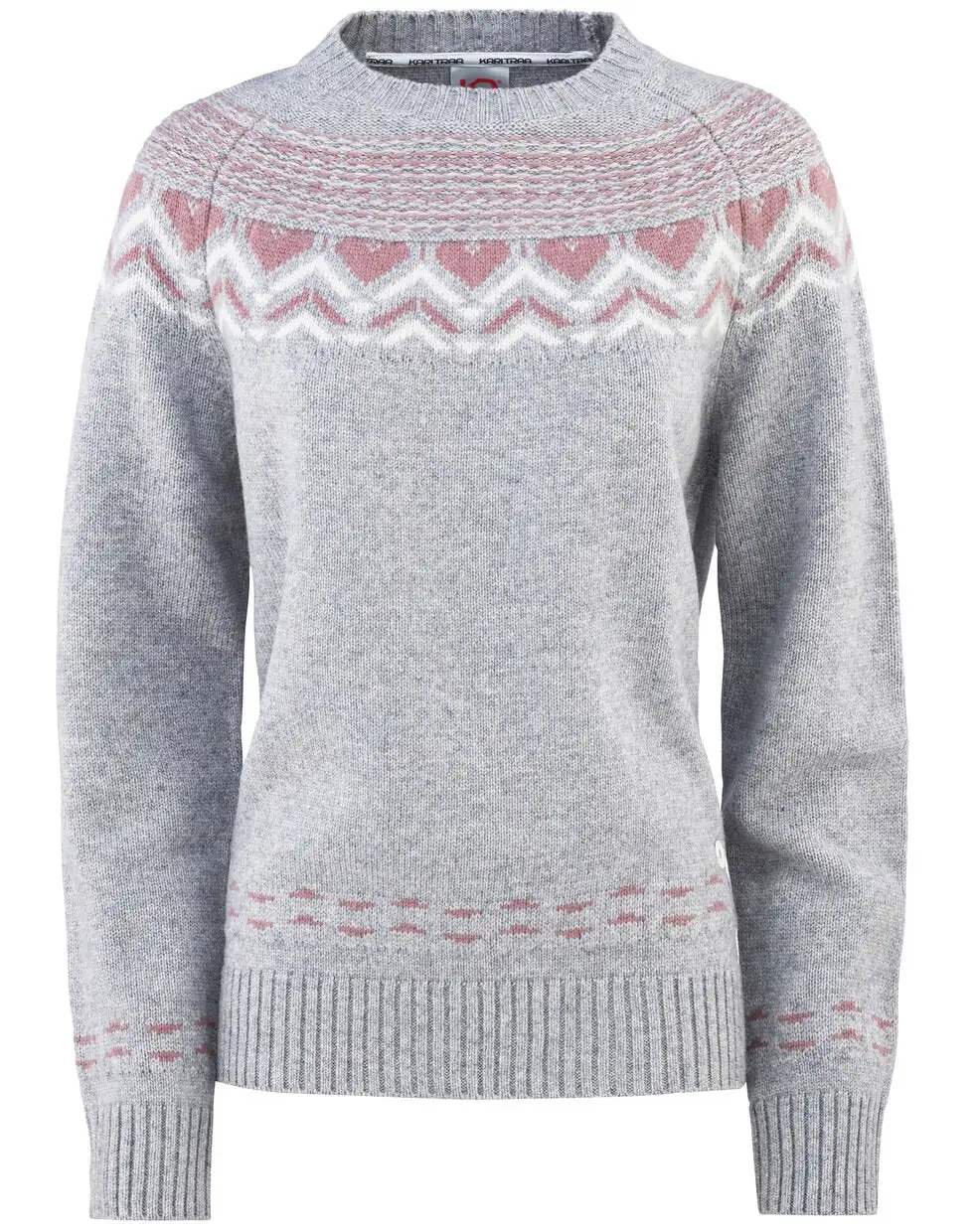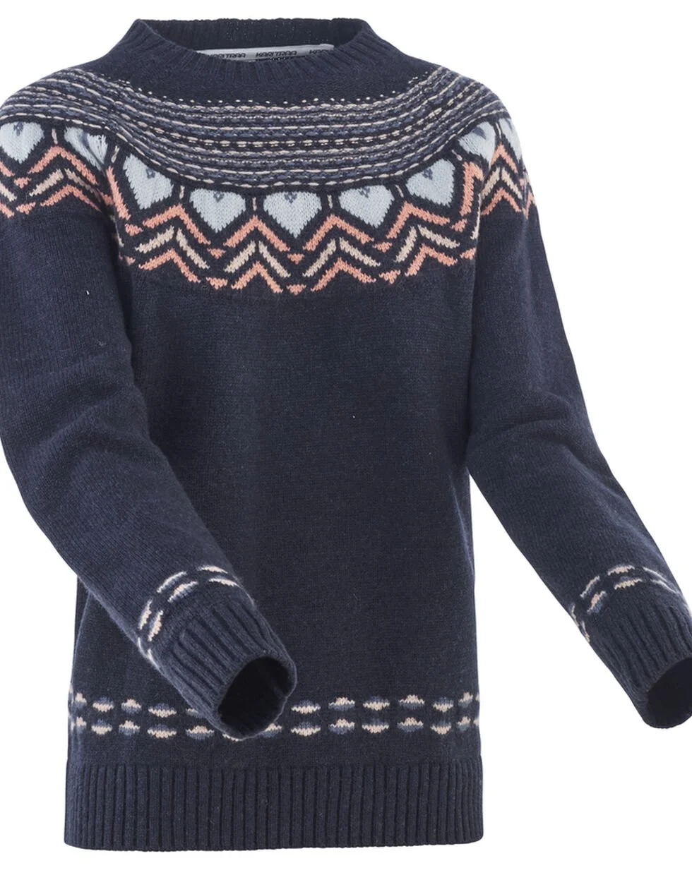 Kari Traa Sundve striktrøje er en varm og cool sweater til kvinder, med et nordisk mønster. En favorit i efteråret og vintersæsonen. Den er lavet af en fleksibel blanding af uld og syntetiske fibre og holder dig dejlig varm, perfekt til at kombinere med flere lag. Det smukke, skandinavisk-inspirerede mønster vikler sig rundt om den runde hals, skuldre og raglanærmer, et mønster, der går igen på sweaterens nederste kant og manchetter.