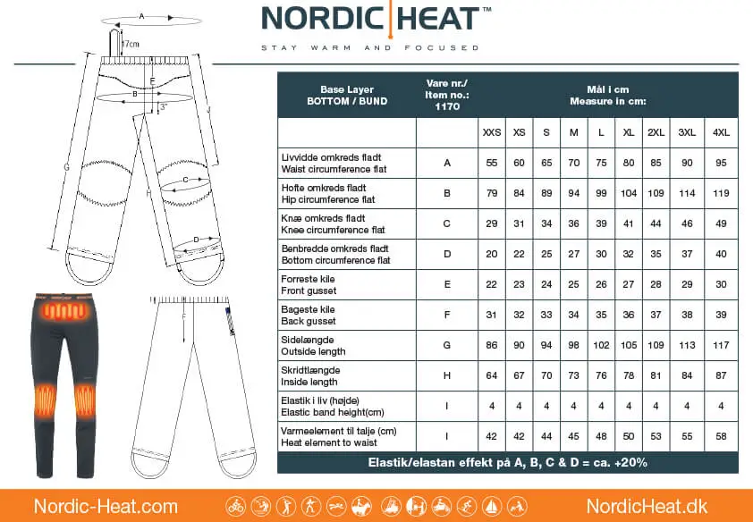 Undertøjssæt med varme: Undertøjssæt i åndbart, svedtransporterende materiale med 15% elastane for maksimal komfort og bevægelsesfrihed. Hold dig varm inderst inde, med tre varmezoner og tre varmeniveauer. Leveres komplet med genopladelige 7,4V batterier og opladere. Undertøjet er syet efter skandinaviske herre-størrelser – mænd skal vælge den størrelse, de normalt bruger. Kvinder skal blot vælge én størrelse mindre, end de plejer.