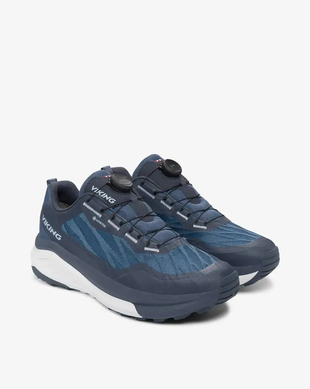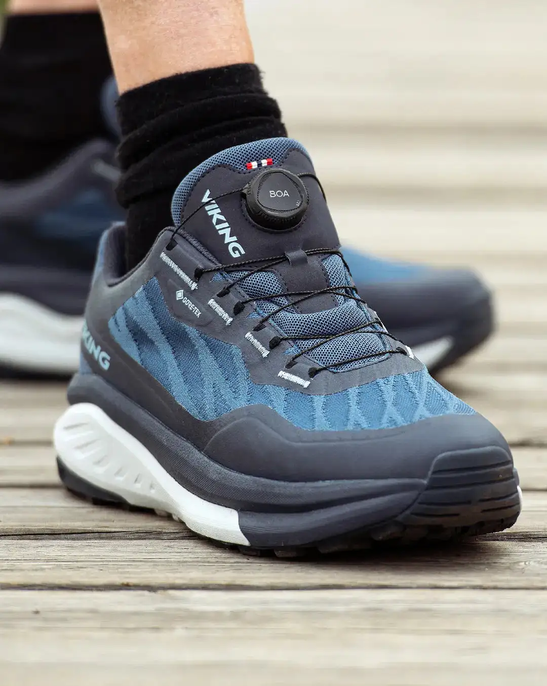 Med Anaconda Hike Low BOA GTX får du alt hvad du behøver til dit næste eventyr! Anaconda Hike Low BOA M giver den perfekte balance mellem støddæmpning og kontrol, takket være en kombinationssål i EVA med varierende hårdhed på de steder, hvor der er behov for det. Med en åndbar og vandtæt GORE-TEX membran, et specieludviklet net på overdelen, de stødabsorberende mellemsåler og selvformende indlægssåler, kan du altid føle dig tryg på krævende og våde stier. Skoens BOA® pasform sikrer, at du hurtigt og nemt kan få skoene af og på, samt justere dem undervejs. UGC® ydersålens nye form sikrer med sit kraftige mønster af naturgummi et pålideligt fodfæste, uanset hvor ruten fører dig hen. Derudover består mange af delene i Anaconda Hike Low GTX BOA M af 100 % genanvendte materialer og er et resultat af en affaldsfri fremstillingsproces, blandt andet forstærkninger, foring og tåkap. Anaconda Hike GTX BOA M med fokus på bæredygtighed – for naturen og dine oplevelser i den!