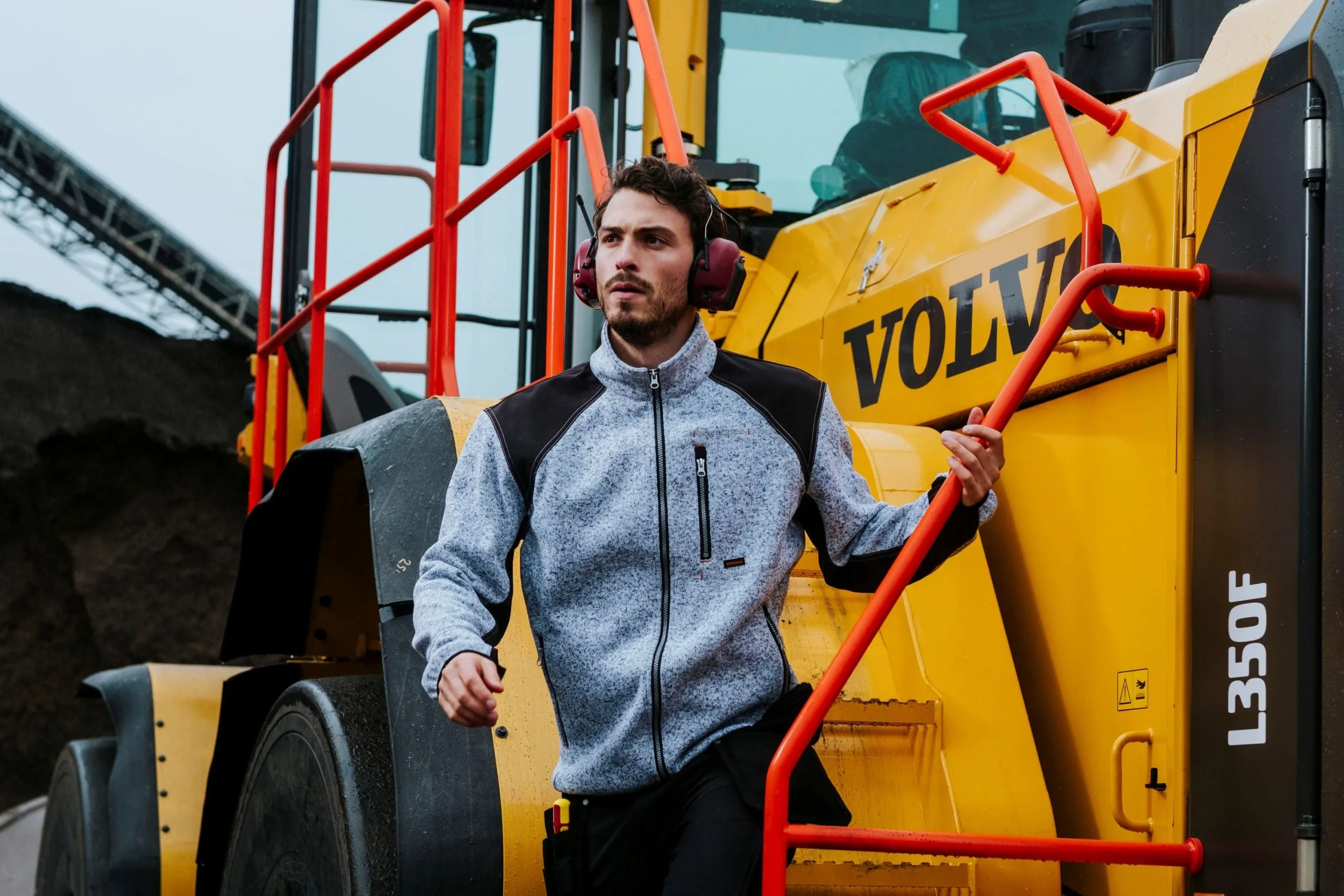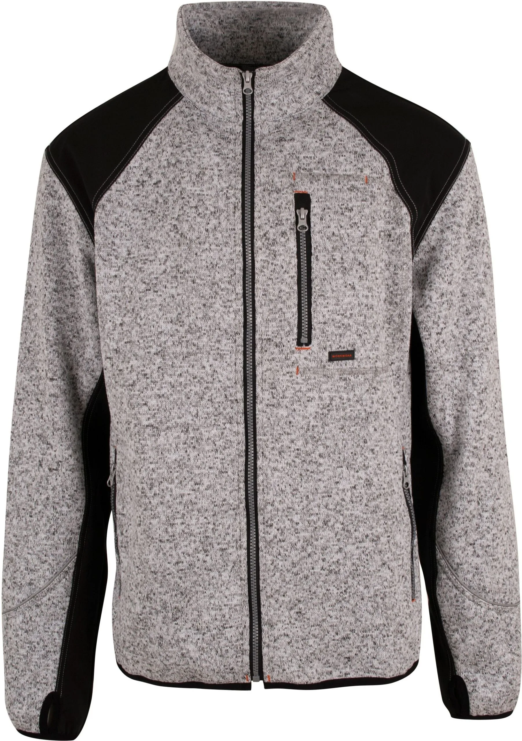 Alt i alt en unisex strikket fleecejakke med kontrastpanel i softshell på skuldre og underarm. Praktiske sidelommer med solid lynlås og ekstra brystlomme i front. Justerbar linning og elastisk piping på ærmer. Børstet inderside og pulsvarmere. Antipill-behandlet og YKK lynlås.